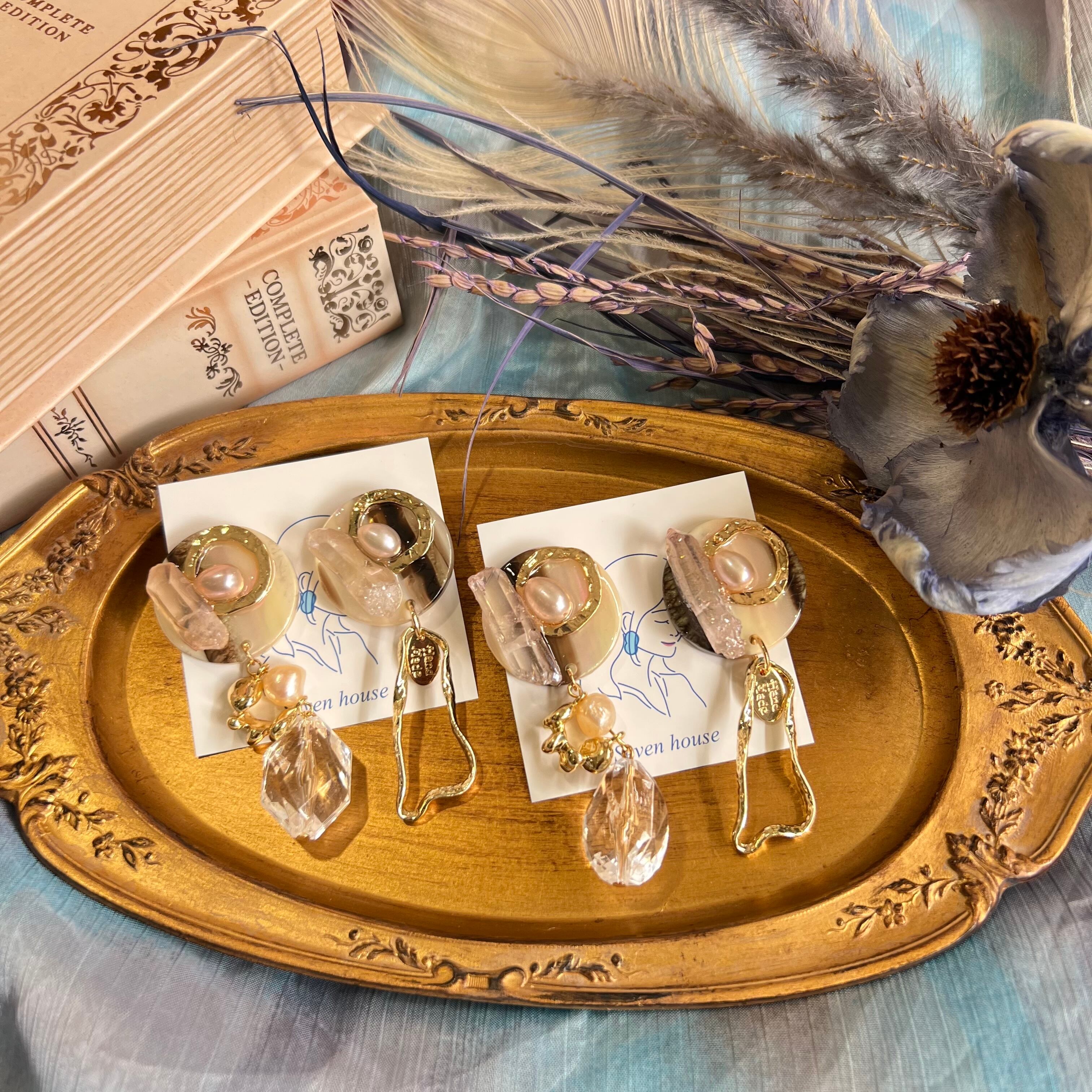 水晶と淡水パールのアシンメトリーピアス イヤリング