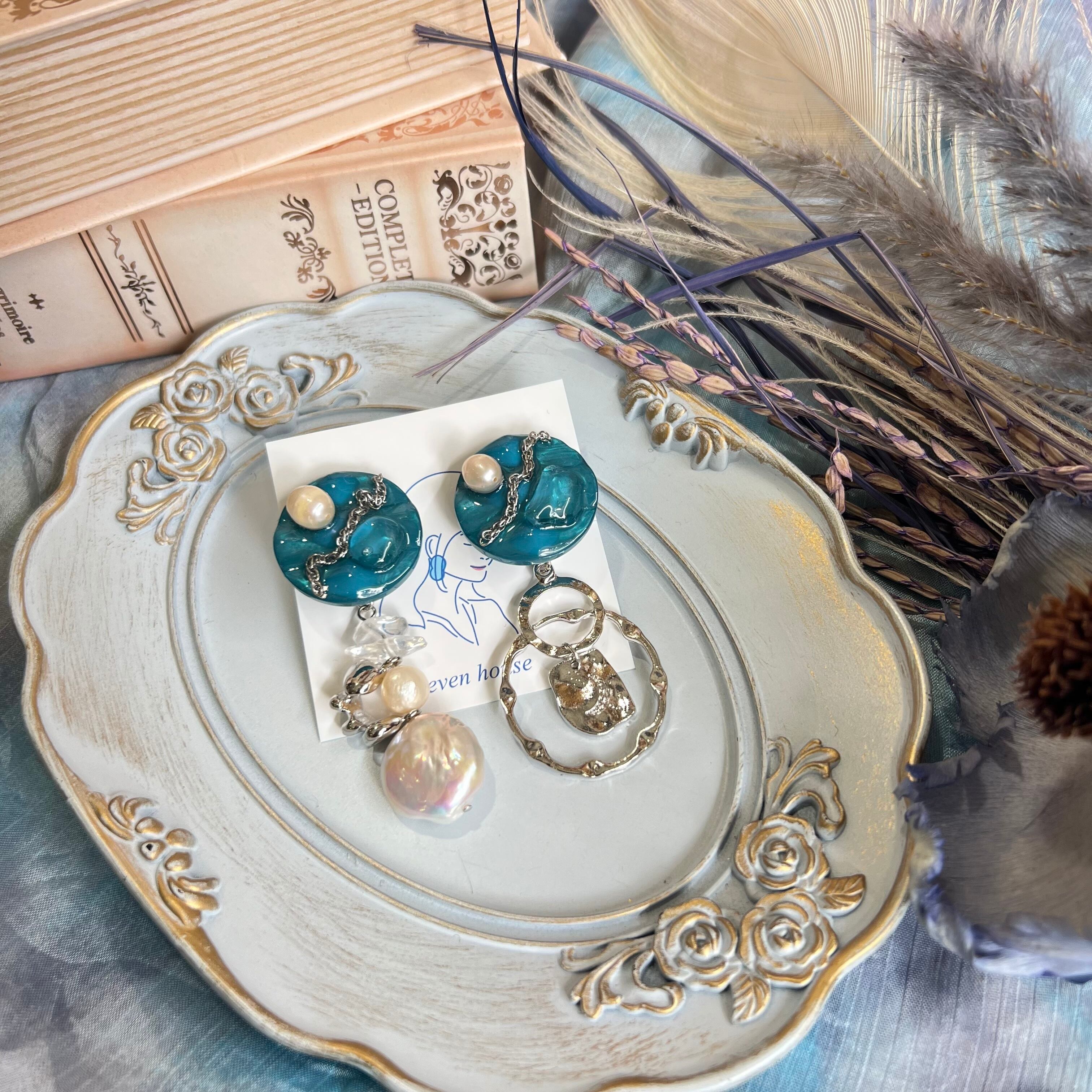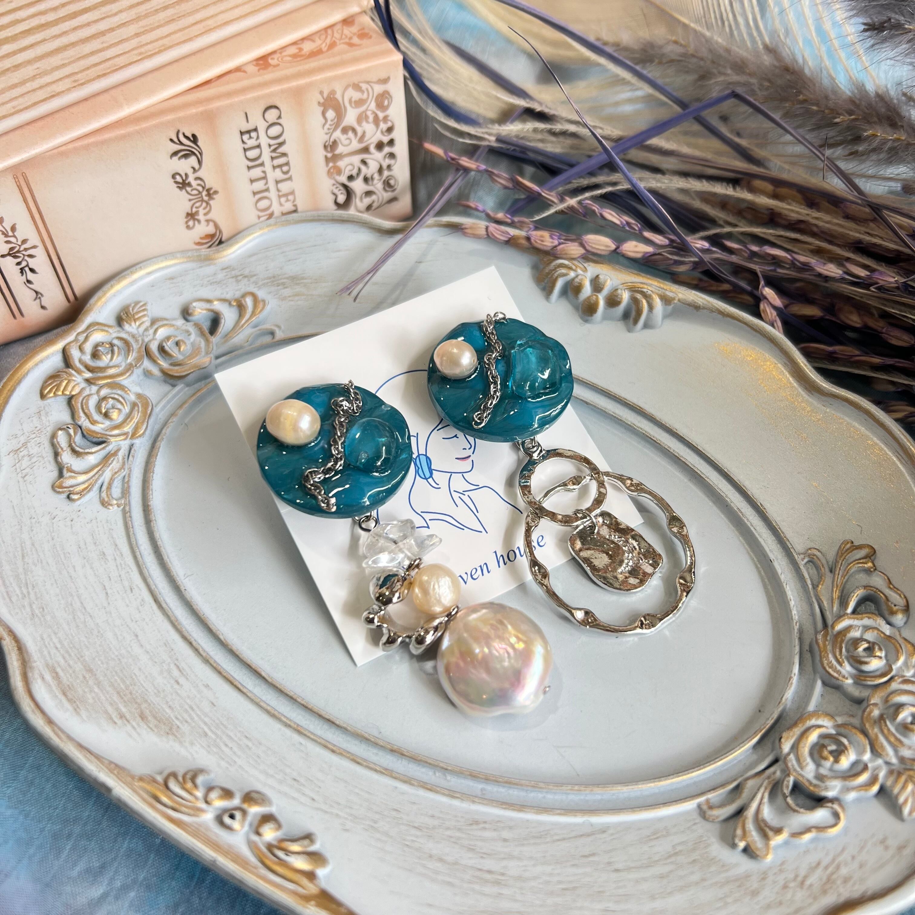 水晶と淡水パールのアシンメトリーピアス イヤリング